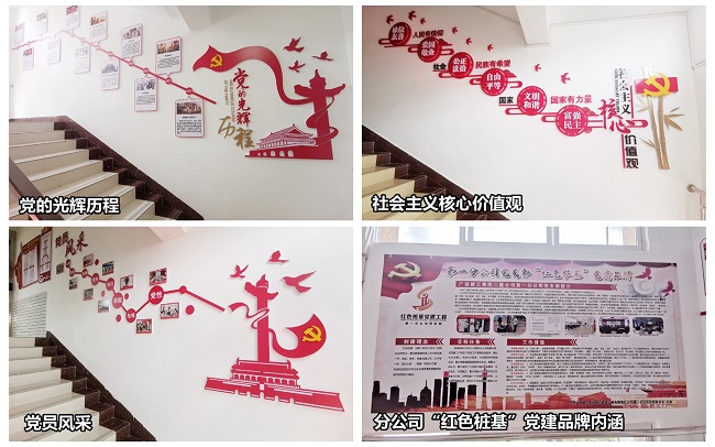 党建文化墙主要分为四大板块,分别是弘扬社会主义核心价值观、中国共产党发展历程、支部党员风采展示、支部“红色桩基”党建品牌简介及成效。通过党建文化墙图文并茂的形式,一方面促进分公司党员更加了解党的发展历史,加强党员党史教育;另一方面,集中展示党支部党建工作亮点和党员干部形象,增强党建工作直观性,拓宽党建工作宣传渠道。
