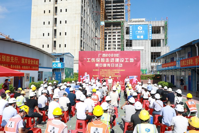 7月22日,由自治区人力资源和社会保障厅、南宁市人力资源和社会保障局、南宁市社会保险事业局主办,广西建工集团联合建设有限公司协办的广西2020年“工伤保险走进建设工地”集中宣传日活动在联建公司南宁民族大饭店项目举行。自治区人社厅工伤保险处处长熊艳,南宁市人社局党组成员、副局长程义,南宁市社保局党委书记、局长唐明,公司党委副书记、总经理李日红,副总经理陈昱任出席。