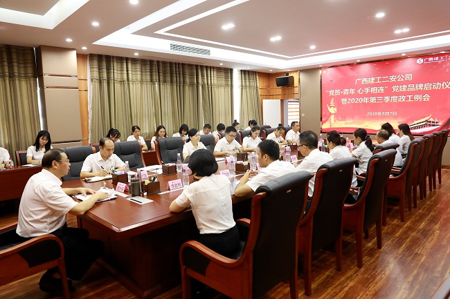 8月7日,广西建工集团第二安装建设有限公司党委在六楼会议室举行“党员•青年 心手相连”党建品牌启动仪式暨2020年第三季度政工例会。公司党委副书记、纪委书记、工会主席黄水保出席并讲话。