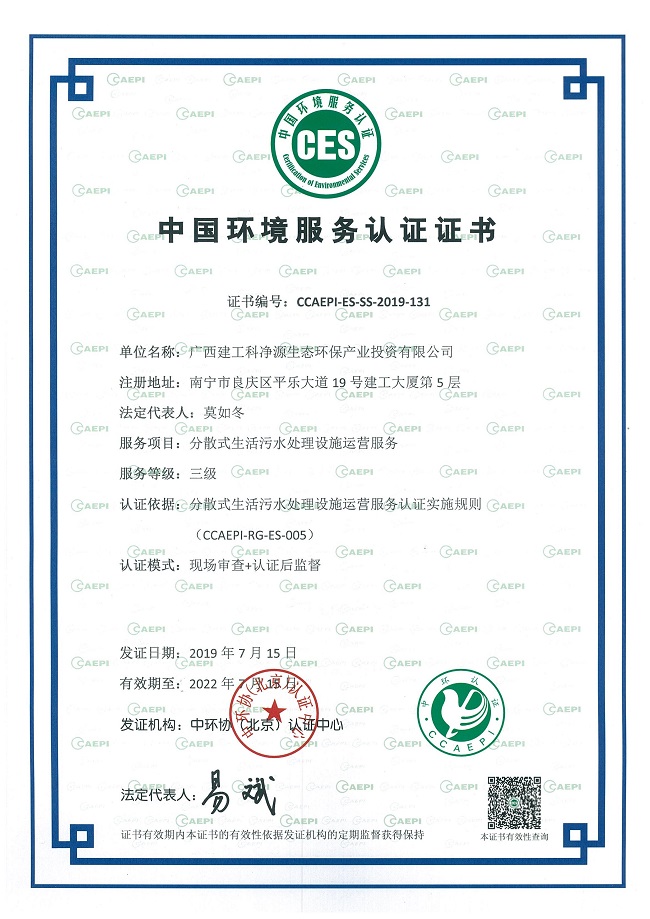 2019-07-18科净源公司喜获中国环境服务认证分散式生活污水处理设施运营服务三级资质