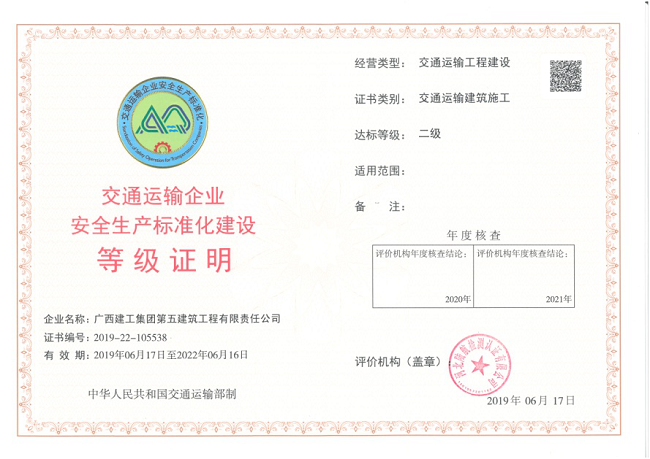 2019-06-26五建公司新增交通运输企业安全生产标准化建设二级资质