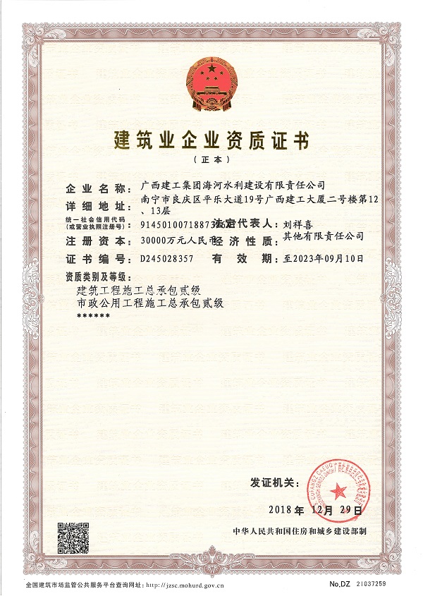 2019-01-09海河公司晋升房屋建筑工程施工总承包二级资质