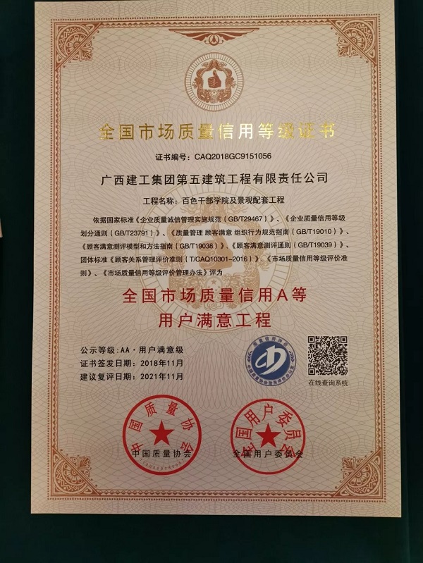 2018-12-22五建公司获“全国市场质量信用A等用户满意工程”奖