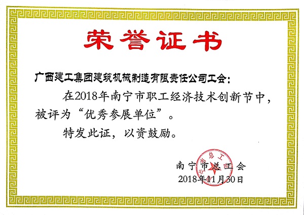 2018-12-04建机公司荣获南宁市职工经济技术创新成果展“优秀参展单位”