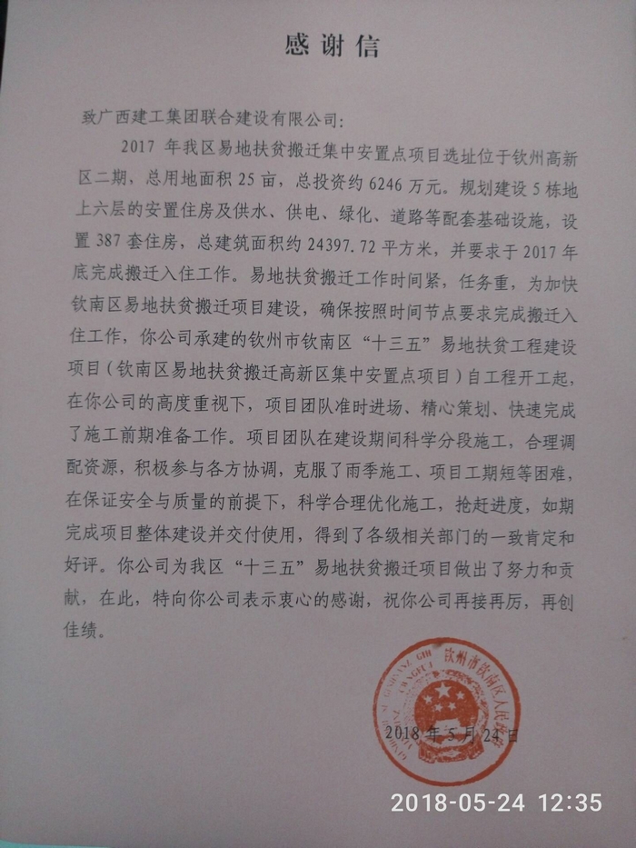 2018-05-28钦州市钦南区人民政府给联建公司发来感谢信