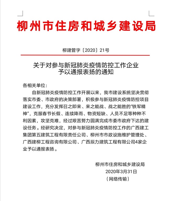 2020-04-01五建公司疫情防控项目建设工作得到柳州市住房和城乡建设局通报表扬