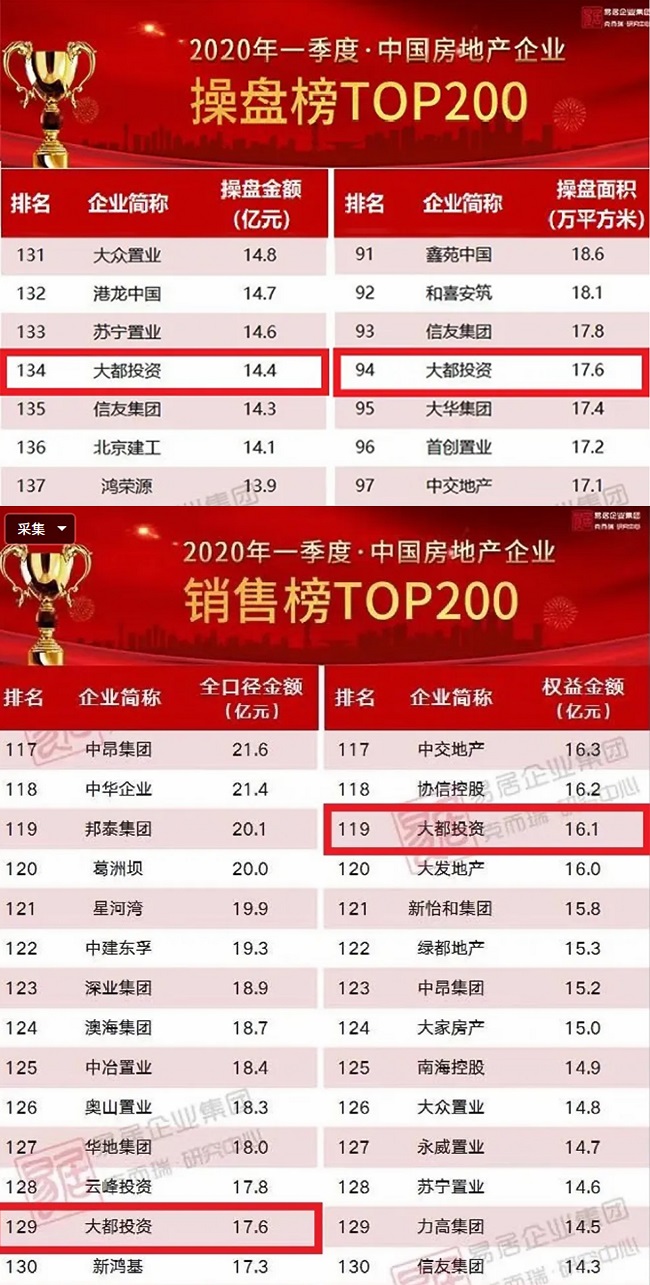 2020-04-01大都投资公司一季度操盘面积跻身全国房企百强