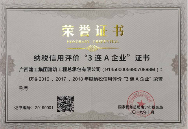 2019-12-31总承包公司获得纳税信用评价“3连A企业”荣誉称号