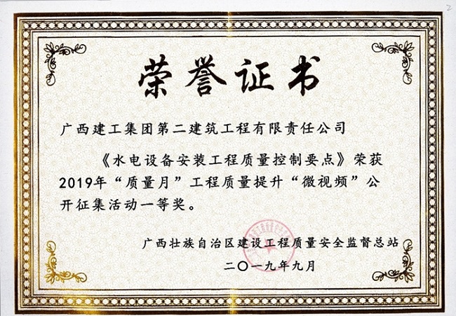 2019-09-26二建公司荣获自治区“质量月”工程质量提升“微视频”征集活动一等奖