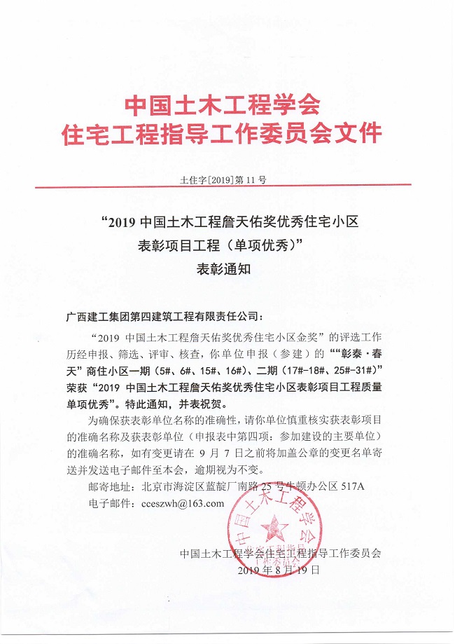 2019-09-03二建公司项目获“詹天佑奖优秀住宅小区金奖”