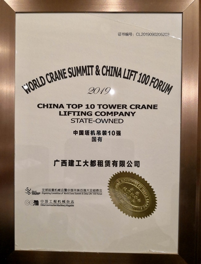 2019-09-06大都租赁公司荣获“中国塔机吊装十强企业”