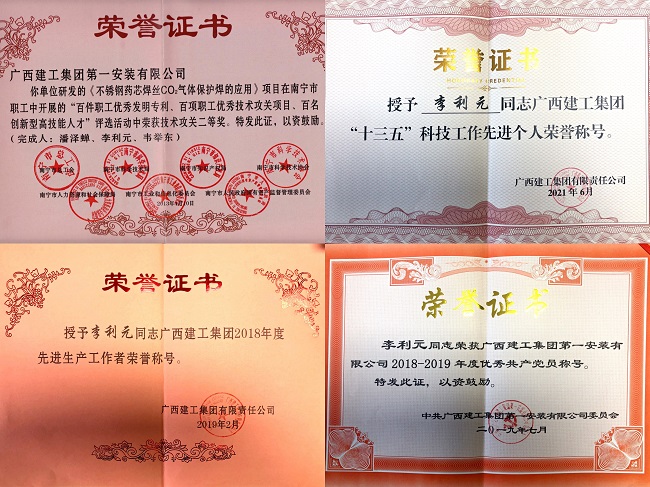李利元获得的部分荣誉证书