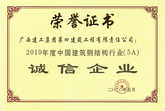 2020-07-10四建公司第四次荣获“中国建筑钢结构行业(5A)诚信企业”荣誉称号