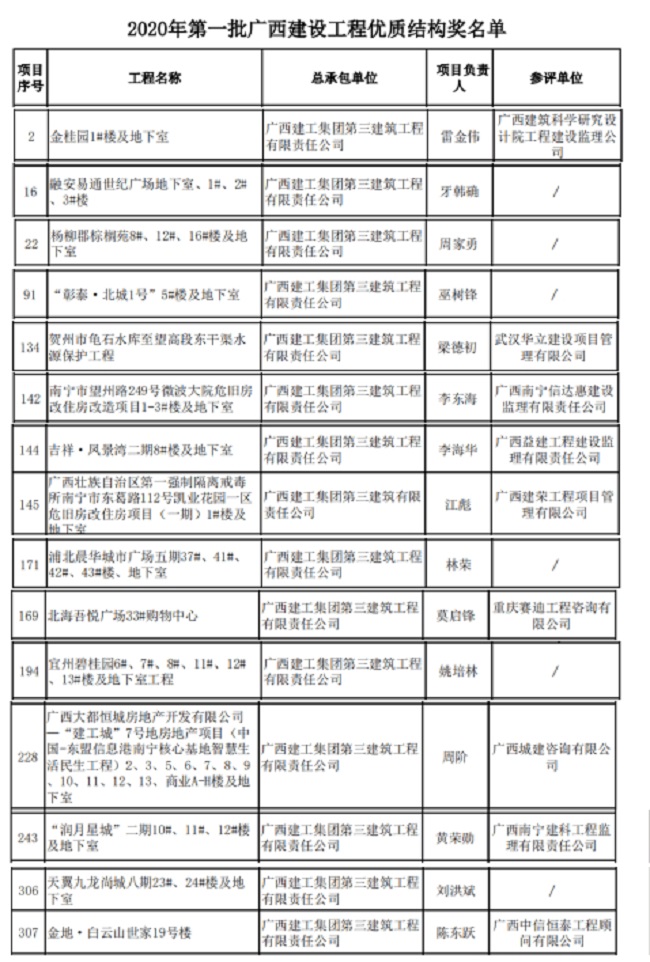 2020-12-25三建公司2020年累计18个项目广西壮族自治区建设工程优质结构奖