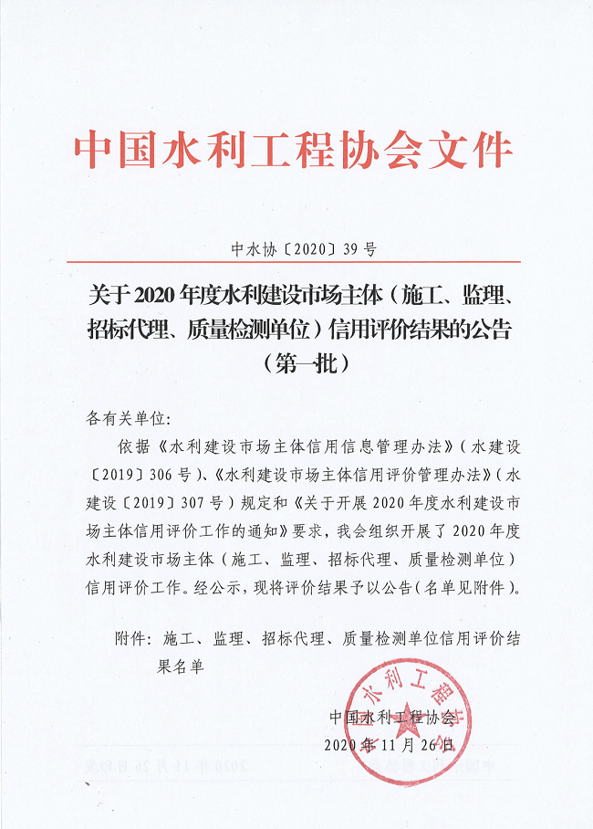 2020-11-28海河公司获评“2020年度水利建设市场主体AAA级信用企业”称号