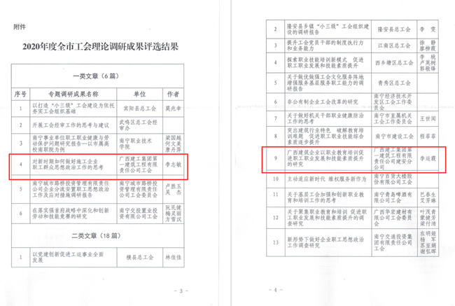 近日,南宁市2020年度工会系统优秀调研成果及理论文章、创新成果评审结果揭晓,广西建工第一建筑工程集团有限公司喜获殊荣,共有3篇工会优秀调研成果获奖,其中一类文章1篇, 二类文章1篇,三类文章1篇。