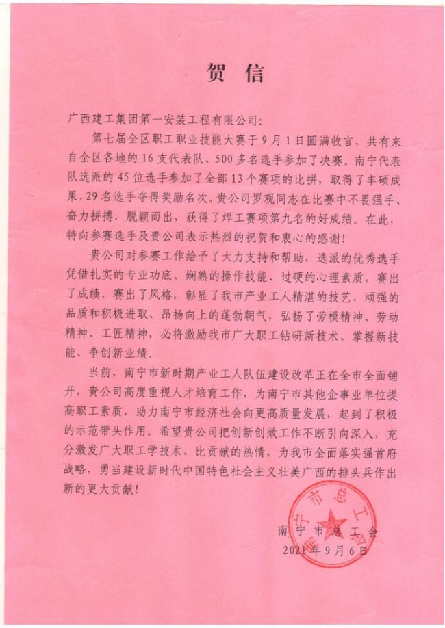 9月16日,广西建工集团第一安装工程有限公司收到南宁市总工会发来的贺信,对一安二分公司员工罗观在第七届全区职工职业技能大赛的优秀表现表示热烈祝贺,对公司的大力支持表示衷心感谢。